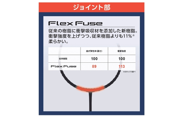 新素材「Flex Fuse」をジョイント部に採用することにより、ASTROX 77使用者に合わせたマイルドな打球感を実現。