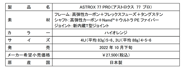 本製品は、オールラウンドな性能と伸びのあるショットが特徴で、男子ダブルスのファジャル・アルフィアン(インドネシア)の他、女子シングルスの世界ランキング上位選手であるチェン・ユーフェイ(中国)やアン・セヨン(韓国)らが使用し好成績を上げている「ASTROX 77」をさらに進化させました。