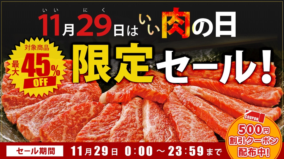 「肉の日限定セール」は毎月29日に開催しているイベントで、その日限りのお得な商品を約190商品販売しています。各商品は通常価格よりお買い得な価格で販売しており、最大45%OFFでご購入いただけます。