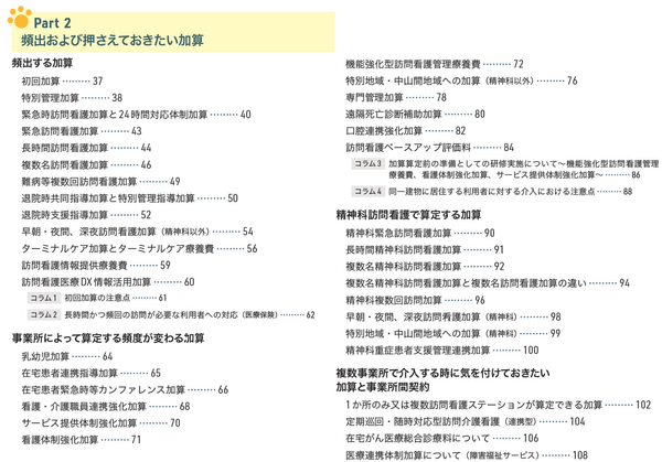 介護報酬・診療報酬における加算項目について、「頻出する加算」「事業所によって算定する頻度が変わる加算」「精神科訪問看護で算定する加算」「複数事業所で介入する時に気を付けておきたい加算と事業所間契約」に分けて解説しています。2024(令和6)年度に改定された項目には「改」マークを、新設された項目には「新」マークを入れています。