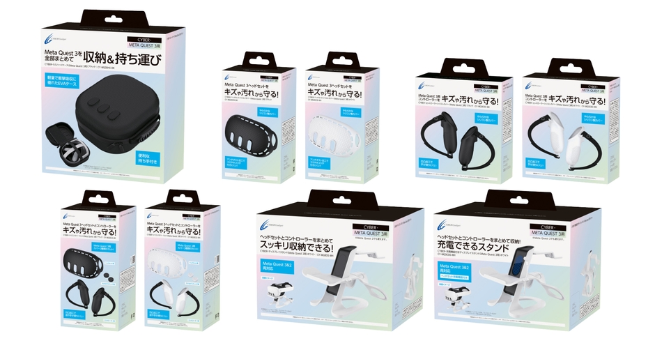 今回発売した製品は、Meta Quest 3ヘッドセット本体とコントローラーなどをまとめて収納できる『CYBER・セミハードケース(Meta Quest 3用)』、ヘッドセット本体やコントローラーをキズや汚れから守る『CYBER・ヘッドセットシリコンカバー(Meta Quest 3用)』『CYBER・コントローラーシリコンカバー(Meta Quest 3用)』『CYBER・シリコンカバーセット(Meta Quest 3用)』、ヘッドセット本体とコントローラーをすっきりと収納できる『CYBER・ディスプレイスタンド(Meta Quest 3用)』『CYBER・充電機能付きディスプレイスタンド(Meta Quest 3用)』の6製品です。