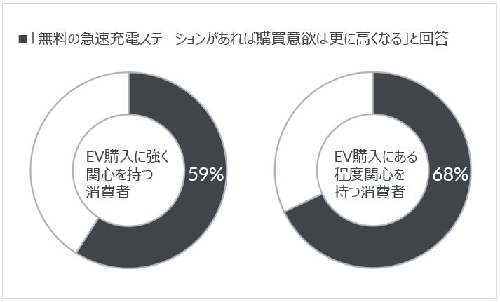 電気自動車購入に関心がある消費者が求めているのは急速充電ステーションの充実で、「電気自動車購入に強く関心を持つ消費者」では10人に6人(59%)が、「ある程度関心を持つ消費者」では3人に2人(68%)が、無料の急速充電ステーションがあれば購買意欲は更に高くなる、と答えています。