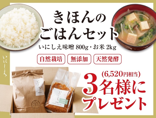 いにしえ社の「きほんのごはんセット」を、アンケートにお答えいただいた方の中から抽選で、3名様にプレゼントいたします。