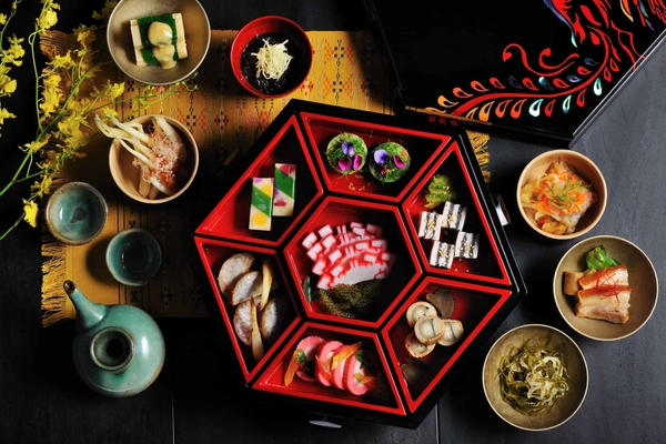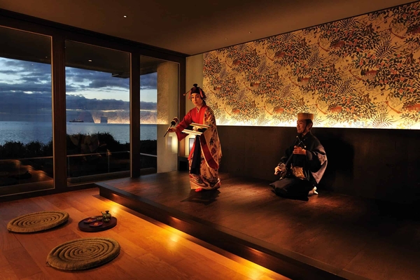 最終日の夜には、客室で歓待の宴が行われます。会場は、宿泊部屋とは別に用意された特別な客室です。琉球王国時代の宴と同じように、琉球料理を楽しんだ後に琉球舞踊を鑑賞します。料理は、琉球料理伝承人による監修のもと、星のや沖縄のシェフがさらに華やかさを加えた琉球料理です。「東道盆(とぅんだーぼん)」と呼ばれる伝統的な漆塗りの器に載せた、鮮やかな料理が卓上を彩ります。琉球舞踊は、少人数・小空間で実施する伝統的な宮廷芸能としての表現にこだわり、寝室を舞台に設え、1組限定で披露します。師範の資格を持ち県内外で活躍する演者が披露する、迫力のある琉球舞踊を目前で鑑賞できます。紅型の壁紙を背景に、艶やかな舞踊の動きや三線の美しい音色を、泡盛を飲みながら堪能します。
