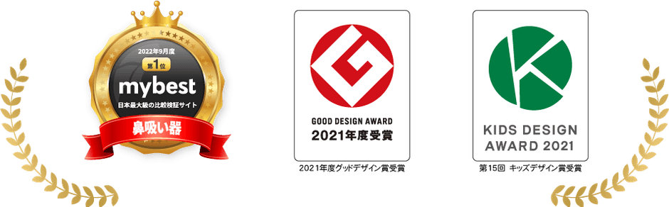 2021年9月の発売以降、日本最大級の比較検証サイトmybestにて鼻吸い器部門1位(2022年9月度)をはじめ、2021年度グッドデザイン賞、第15回キッズデザイン賞を受賞いたしました。