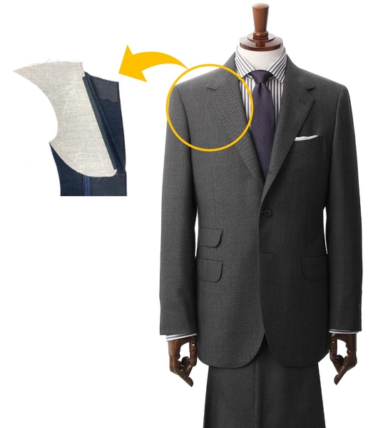 柔らかくソフトな芯地を使い、胸元から肩の後ろまで毛芯を延長することで、軽く軽快な着用感に仕上げつつ胸元のボリュームを維持しています。
