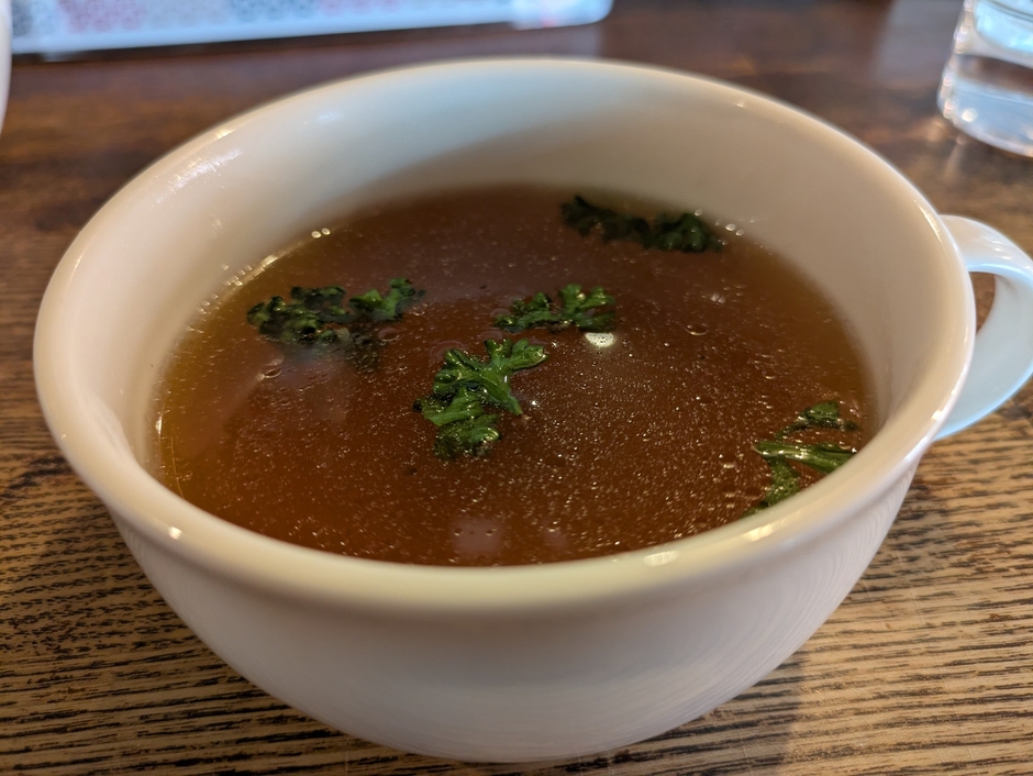 サラダ・スープはバイキング形式、ライス付きで満足感のある内容です。