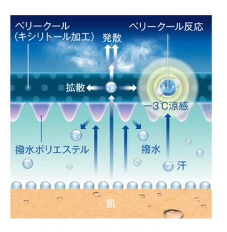 ウェア内を3℃低く保つ「ベリークール」と肌面をドライにする機能を併せ持つ新素材です。生地に配合したキシリトールが汗に反応して熱を吸収。また、汗を素早く吸収・拡散させて乾燥を促進させる生地構造を採用しています。クーリング効果と汗のベタつきのストレスを軽減させることで選手のパフォーマンスを向上させます。
