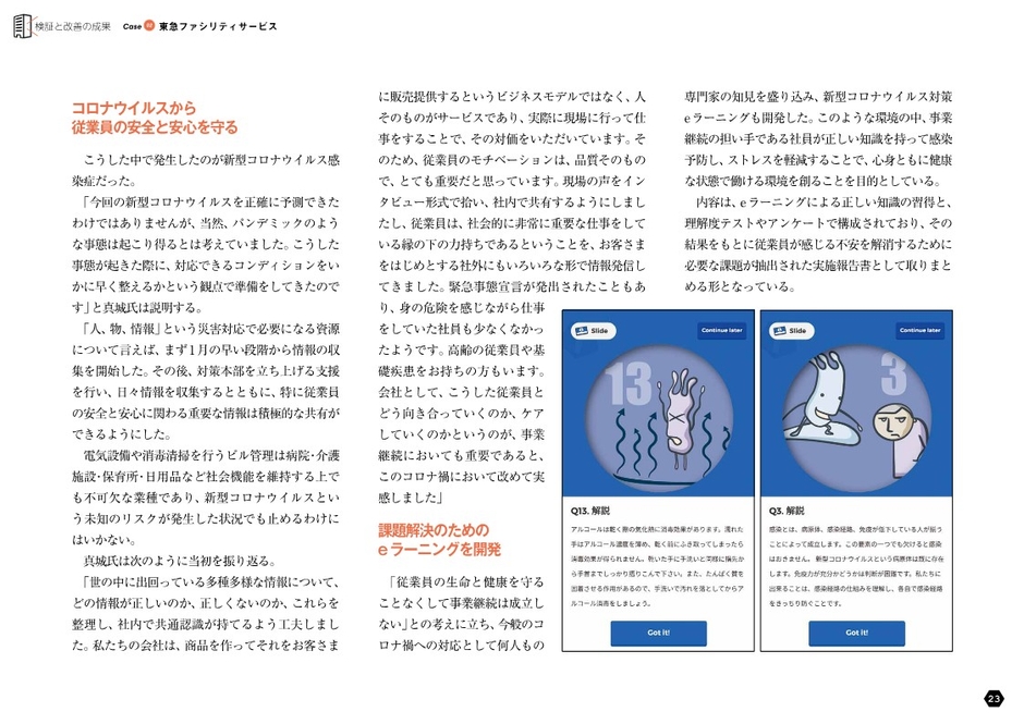 そうしたテーマでお届けする「月刊BCPリーダーズ」11月号は、災害やパンデミックの経験を検証し自社の危機管理やBCPの改善に生かす企業2事例を紹介。1社は新型インフルエンザ以降徹底した感染症対策に取り組むことで円滑に事業継続を図るディスコ(東京都)、もう1社は東日本大震災以降オールハザードに対応できるBCP構築を目指して活動する東急ファシリティサービス(東京都)です。