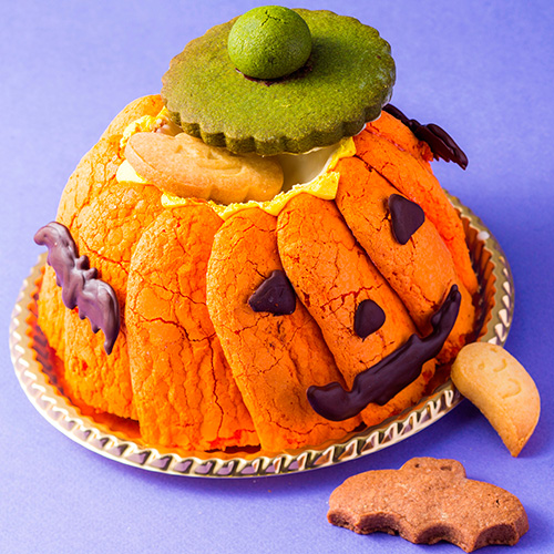 かぼちゃの色合いを施したビスキュイ生地をドーム状に敷き込み、ブリュレを忍ばせたレアチーズを流し込みました。クッキーでできた帽子を開けると中に小さなお菓子が入っています。
