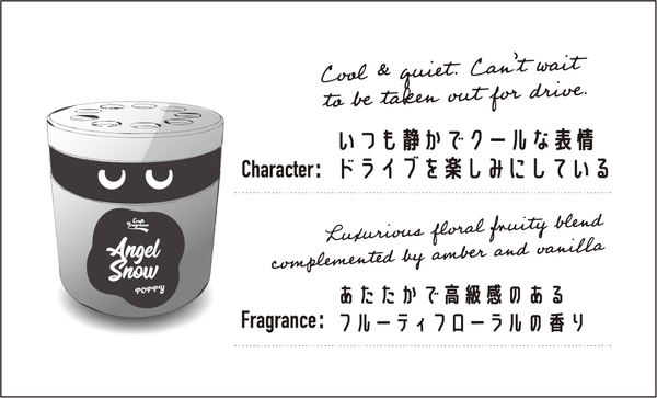 今回発売のウィズはフレグランスの妖精が容器から覗いている、キャラクター性を持たせた自動車用芳香剤です。