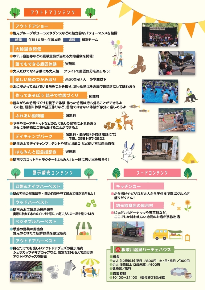 その他、地域の農産物や関市の刃物、木工製品の展示販売コンテンツでのお買い物も楽しめます。そして地元の飲食店の出店やキッチンカーでのイベントならではのフードコンテンツもご用意しております。これらの多彩なコンテンツを通じて関市板取の魅力を感じていただけることでしょう。