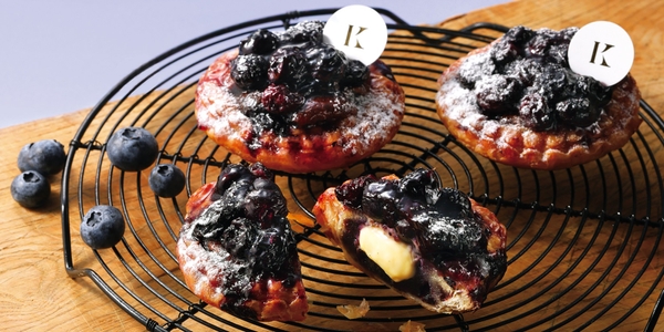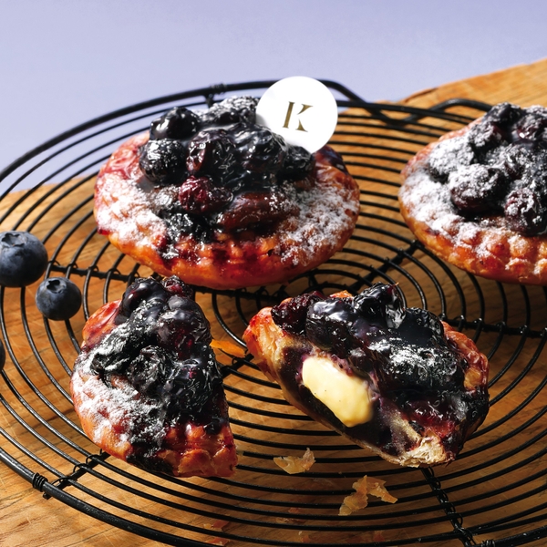 北海道余市産のブルーベリーをたっぷりと飾り、中には自家製カスタードクリームを詰め、2種のブルーベリーをブレンドしたコンポートを入れて焼き上げました。サクサク食感のパイにブルーベリーの甘酸っぱい果実感と香りをお楽しみいただけます。