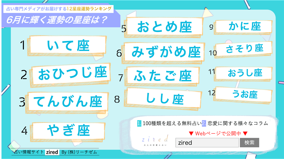 2023年5月30日、占いメディアのzired(URL:https://zired.net 運営会社:株式会社リーチゼム)は『zired 6月運勢ランキング』無料配信を開始しました。本リリースではその鑑定文章をすべて公開しています。