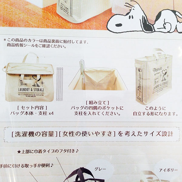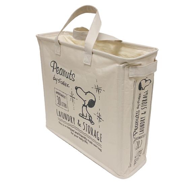 ランドリースペースに溶け込むスリムなランドリーバッグは、一人分の洗濯物にぴったりの30Lサイズ。サイドにもスヌーピーがいるので、洗濯機のすき間に入れてもキュートなおかおが拝めます♪