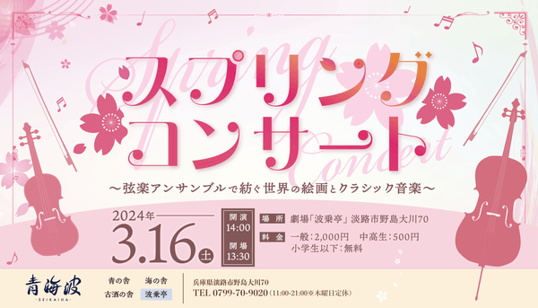 淡路島西海岸の劇場&レストラン「青海波-SEIKAIHA-」内にある劇場「波乗亭」では、世界で愛される7つの春の名曲をお届けする『スプリングコンサート ~弦楽アンサンブルで紡ぐ世界の絵画とクラシック音楽~』を3月16日(土)に上演いたします。