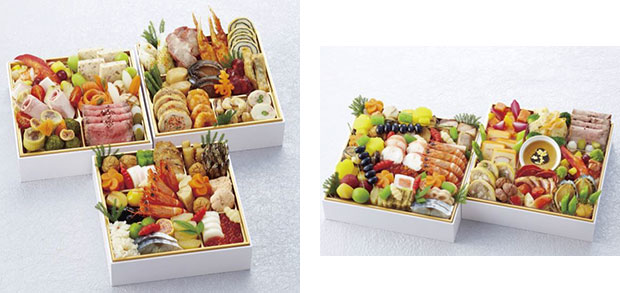 (左)三段重「七福神」 / (右)二段重「煌」ホテルだからこそできる和洋中の競演、三段重おせち「七福神」をはじめ、フランスの高級食材や厳選した素材を独創的にアレンジした和洋の二段重「煌(きらめき)」など計3種類を販売いたします。