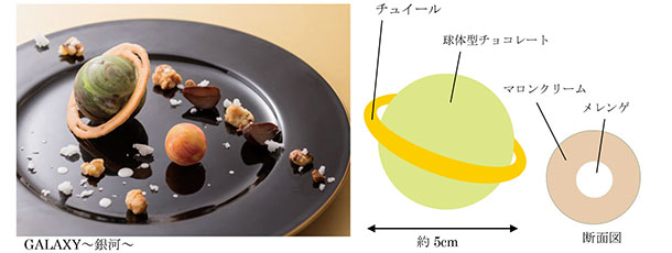 昨年に続き“球体モンブラン”の第2弾が登場。今年は「球体=惑星」をイメージし、すべての要素を洋菓子で作り、本格的な宇宙空間を再現。惑星から環(わ)、回りの隕石をイメージし作り上げた一皿です。