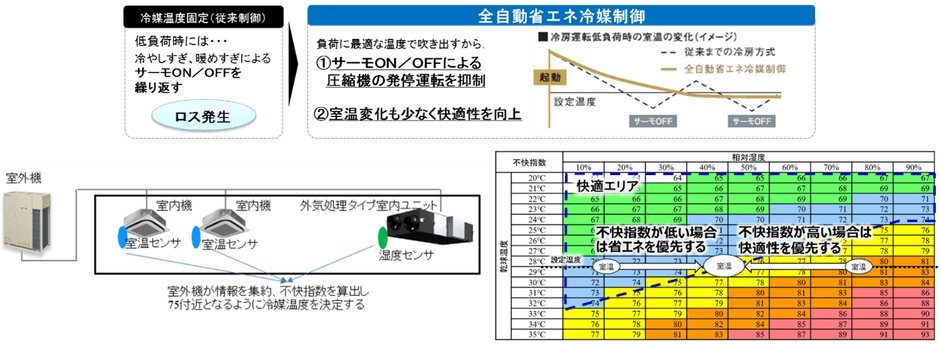 空調機器と換気機器を連動させ、システム全体で最適な省エネ運転をすることで、消費電力の削減と快適性の両立を実現する、新しいビル用マルチエアコンです。温度と湿度から算出される不快指数に基づき空調システムを自動制御することで、快適性と省エネ性を両立し、年間消費電力を約7%※2削減しました。また中間期においては涼しい外気を居室に導入し、空調機の運転を抑えることで年間消費電力をさらに約2%※3削減します。