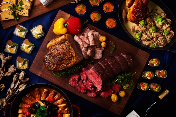 牛肉のローストビーフ、クリスマスカラーのピッツア、とろっと牛すじ煮込みの黒ハヤシ、若鶏ときのこのフリカッセ グレインズのリゾットを添えて、アンコウの唐揚げ ゆず塩を添えて、豚のジューシーロースト シャリアーピンマリネ、魚介類のブイヤベース 地中海風、香ばしく揚げたジューシー手羽先 オイスターの香り、茄子とじゃがいものムサカ風、きのことくるみのパスタ、リヨネーズポテトとソーセージ、きのこのポタージュスープ、他