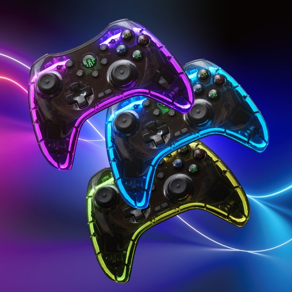半透明なクリアブラックデザイン。内蔵LEDを搭載しており、コントローラーが光輝きます。