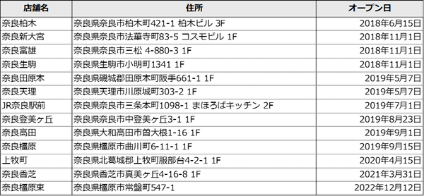 ●奈良県内のエニタイムフィットネス店舗 ※オープン日順