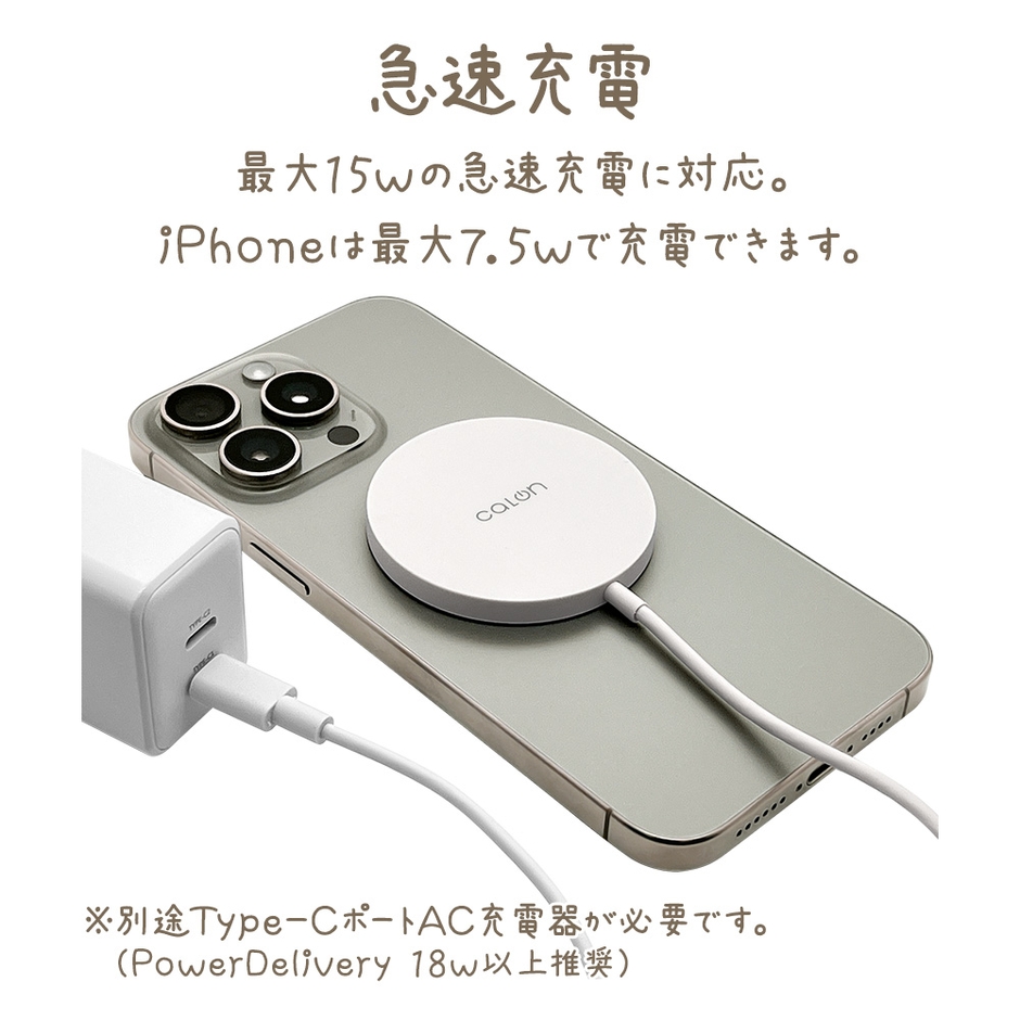 高出力充電に対応するスマートフォンは最大15Wの急速充電、iPhoneは最大7.5Wで充電できます。