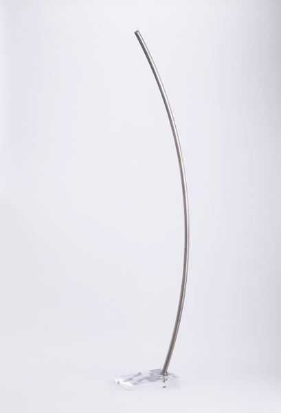 傾斜したアクリルベースに、美しく弧を描いたステンレスパイプが溶け込む、一点掛け ハンガーラック 「 Bow 」。