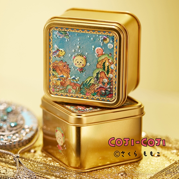 缶の蓋面や側面、缶の中の底面まで、さくらももこ先生が描いた扉絵のイラストが描かれています。細かなエンボス加工にこだわりミニチュアサイズのコジコジと海の仲間たちがキラキラと輝きます。そして、開けると飛び出す”物知りじいさん”がポイント!