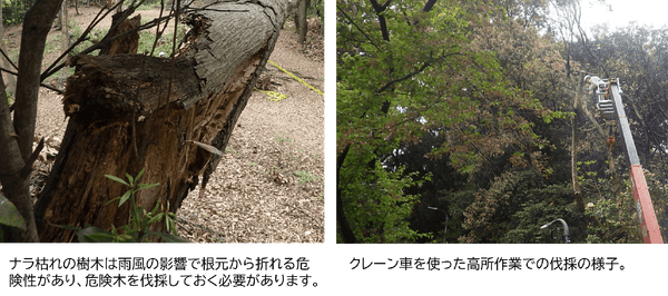 近年、鴻巣山ではナラ枯れという病気が急速に広がり、この美しい里山の一部が失われる危機に直面しています。「ナラ枯れ」とは、森林病害虫であるカシノナガキクイムシが病原菌である「ナラ菌」を増殖させることで、水の吸い上げる機能を阻害して枯死させる樹木の病気です。ナラ枯れの木を放置すると、病害虫が伝染し周辺の木を新たに枯らしてしまい、枯渇した木は雨や風の影響を受けた場合に折れやすく、非常に危険です。今回、急速に進行する鴻巣山のナラ枯れに対処し、豊かな自然環境と森の生態系を守り、安心して鴻巣山を楽しんでもらうためにこのプロジェクトを立ち上げました。