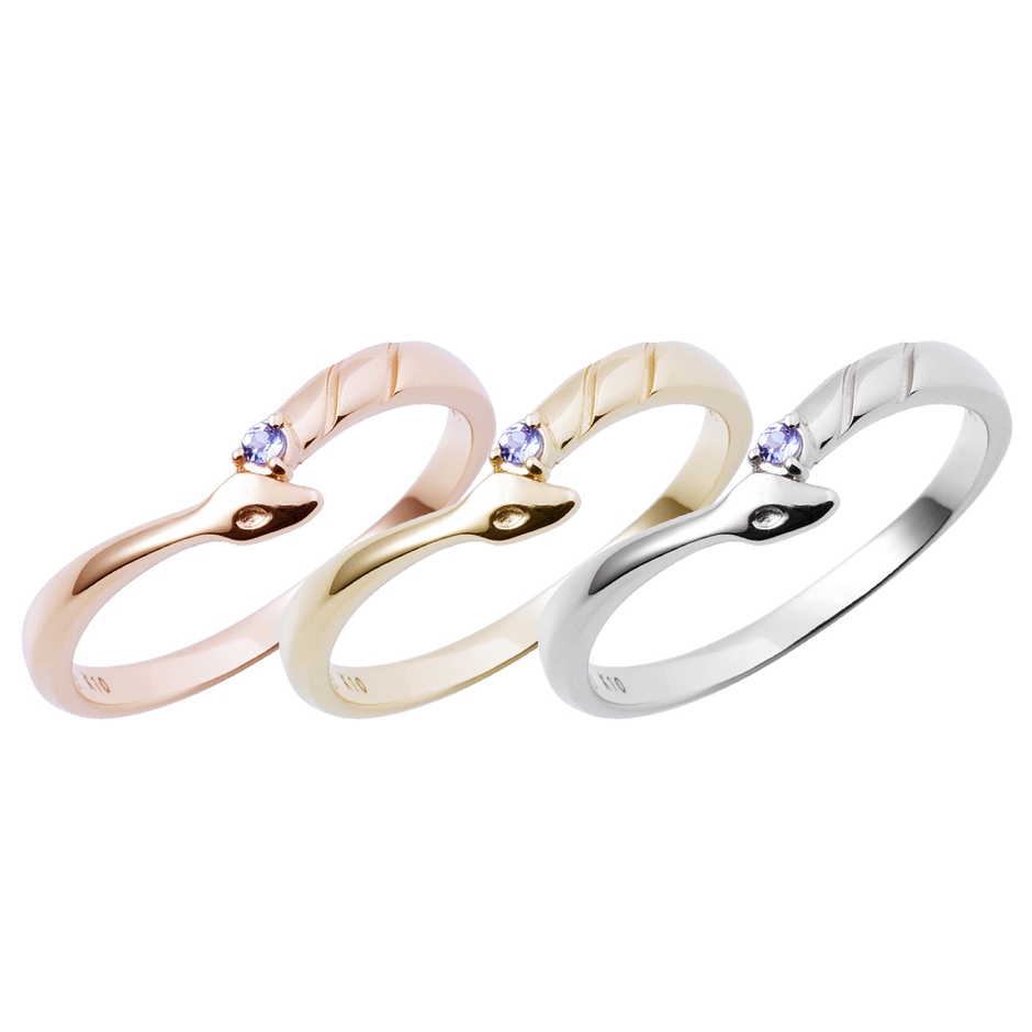 細身のV字タイプのリングにイメージカラーストーンをセットし、蛇や口元の布をデザインに取り込んだシンプルで普段使いのしやすいデザインです。