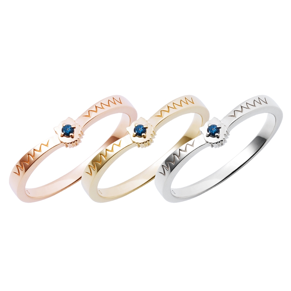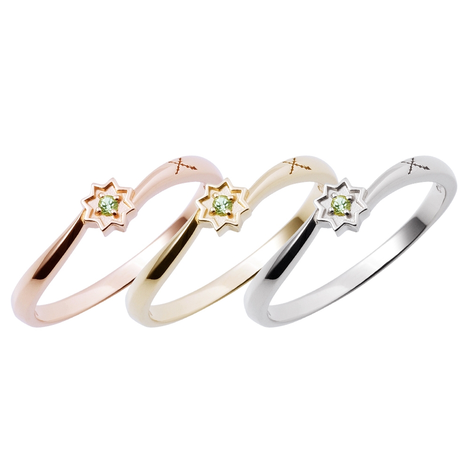 細身のウェーブタイプのリングにイメージカラーストーンをセットし、三つ編みの髪や刀の鐔をデザインに取り込んだシンプルで普段使いのしやすいデザインです。
