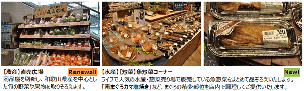 入口近くの農産売り場はレイアウトを変更し、よりお買い物しやすい売り場にリニューアルいたします。また、魚惣菜を選びやすく水産と惣菜の2部門合同で展開するほか、加工食品・日配食品の売り場を1.2倍に拡大いたします。