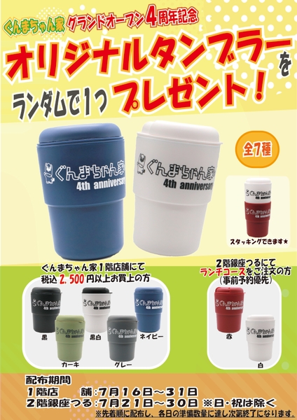 ぐんまちゃん家1階店舗にて、税込2,500円以上商品をお買い上げの方、2階銀座つるにてランチコースをご注文の方(事前予約優先)にぐんまちゃん家4周年記念オリジナルノベルティ「タンブラー」をプレゼント!