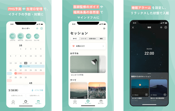 「きつい時は何もできない」というのがPMS・生理期間、それに伴う感情が沈んだうつ状態に悩まされる人の本音です。ただただリラックスすることを目的に、イライラやだるさなどの「その気持ち、ポイっと」する機能として、睡眠アラームと寝る前のヨガや、福岡の大自然で収録した自然音を聴きながら寝落ちする体験をご用意しました。収録しているサウンドに関して、自然豊かな福岡県糸島市の自然を収録し、数々のゲームサウンドを手がけるStudio10代表 岡本氏(https://studio10.jp/))に収録・編集・監修をしていただき、ハイクオリティな音でリラックス体験をお届けします。