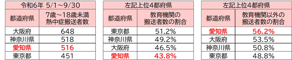 子供は大人に比べて熱中症になりやすい傾向にあります。これは、体温調整機能が未発達で汗をかきにくい、体内の水分の割合が高いなどの理由で、暑さの影響をより強く受けるためです。愛知県は、7歳~18歳未満の熱中症搬送者数が全国で3番目に多く、特に小学校・中学校などの教育機関以外で発生の割合が高い傾向にあります。今年も厳しい暑さ予報が出ており、細心の注意が必要です。
