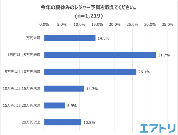 夏レジャーの予算は「1万円以上5万円未満」が31.7%、2位が「5万円以上10万円未満」で26.1%、3位は「1万円未満」で14.5%でした。