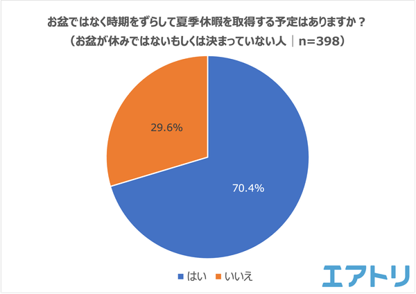 就業中でお盆休みではないもしくはまだ決まっていない人に、お盆以外で夏季休暇を取得する予定があるかを聞いたところ、70.4%が「はい」と回答しました。「いいえ」は29.6%でした。7割の人がお盆以外で夏季休暇を取得することがわかります。