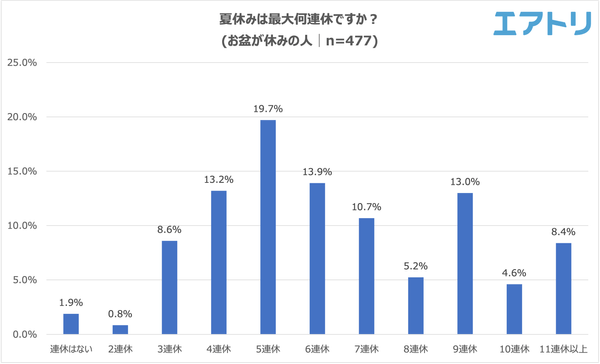 今年の夏休みは「5連休」が19.7%、「6連休」が13.9%、「4連休」が13.2%となりました。