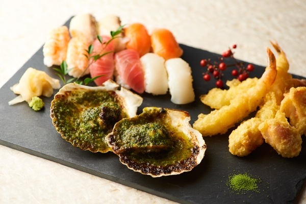 フォワグラ茶碗蒸し、握り寿司、蟹・海老の天婦羅、帆立貝のグラティネ、寒ブリのお造り、牛頬肉シチューのパイ包み焼、他