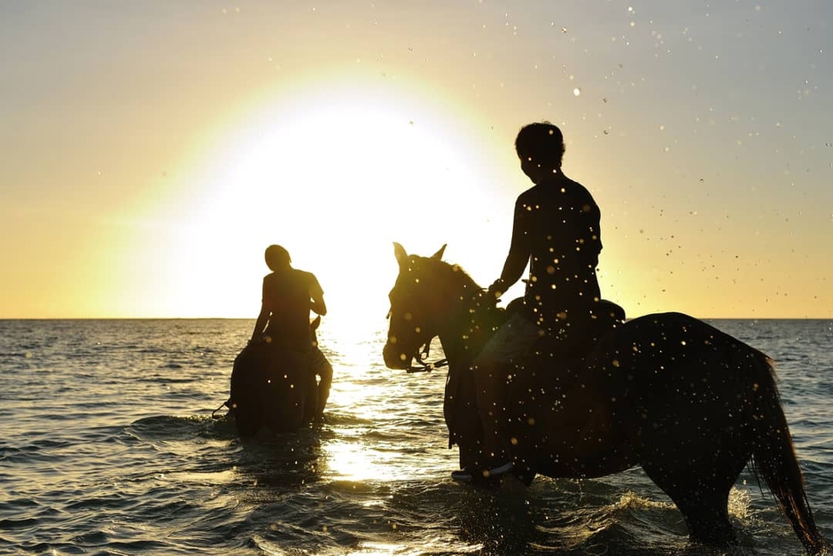 沖縄で親しまれてきた美しさにこだわる乗馬の形を参考に、西日に輝く海の中を歩く乗馬を体験します。はじめに基本的な馬の乗り方を学んでから、浜辺へ出て約30分間の散策を楽しみます。馬は温厚で人懐こく、ホーストレーナーが常にそばについているため、乗馬初心者でも問題ありません。当アクティビティでは、浜辺の上を歩くだけではなく、馬と一緒に海に入ることができます。海水に触れることで一日の暑さから解放され、大自然の中で馬と触れ合うひとときに心が癒されます。輝く海の中を馬と歩む、非日常な体験ができます。