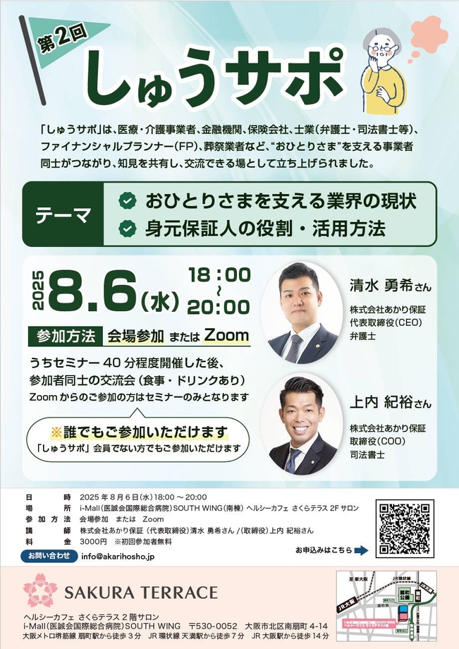 医療複合施設「i-Mall」(医療法人医誠会 本社:大阪府大阪市、代表:谷幸治)内、医誠会国際総合病院併設のヘルシーカフェさくらテラスにおきまして、8月6日(水)『おひとりさまをサポートする事業者コミュニティ 第2回「しゅうサポ」』(主催:株式会社あかり保証)を開催いたします。