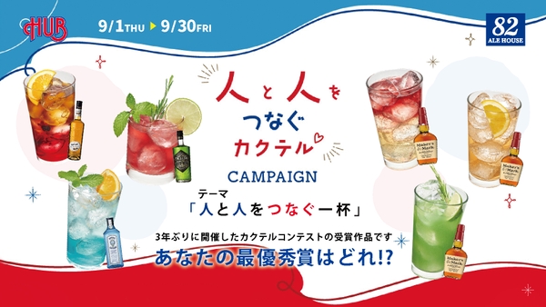 株式会社ハブ(本社:東京都千代田区、代表取締役社長:太田 剛)は、HUB・82の両ブランドにて社内カクテルコンテストの入賞6作品を、2022年9月1日より期間限定で提供する『人と人をつなぐカクテル CAMPAIGN』を実施いたします。