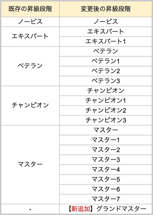 既存の昇級段階(ノービス、エキスパート、ベテラン、チャンピオン、マスター)を細分化し、マスターの上に新段階「グランドマスター」を追加しました。