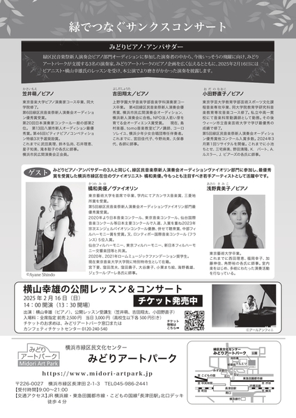横浜市緑区民文化センター みどりアートパークのピアノ企画等を広くPRする「みどりピアノ・アンバサダー」3名のピアニストによるコンサート。