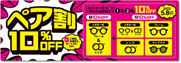 「①メガネ一式」にプラスして「②メガネ一式・フレーム・レンズ・サングラス」のいずれかを同時購入で、①も②も10%OFF! ご家族同士、ご友人同士、もちろんお一人様での同時購入もOKです!