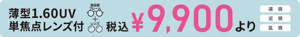 うす型1.60UV単焦点レンズが付いて、メガネ一組 税込¥9,900より、その他豊富にご用意しております。
