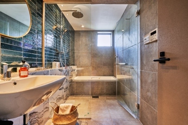 ガラス張りの浴室は開放感にあふれ、まるでリゾートホテルにいるかのような気分を味わうことができます。さらに通常のシャワーに加え、レインシャワーも完備。全身をやわらかな雨に包まれるような心地よさでサイクリング後の汗を流すには最適です。