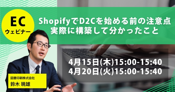 図書印刷株式会社は、D2Cに関心をお持ちのマーケティング・経営企画部門のご担当者様を対象とした無料オンラインセミナー『ShopifyでD2Cを始める前の注意点 実際に構築して分かったこと』を、来る4月15日(木)、20日(火)に開催いたします。