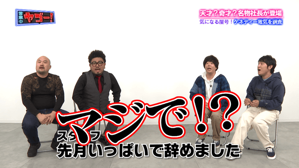 広島ホームテレビ(本社:広島市中区)は、2022年10月の放送が好評だった宮下草薙、鬼越トマホークのダブルMCによる異色バラエティ番組「ヤゴー! 気になるお店に行ってみた」を、2022年12月4日(日)深夜1時5分から再放送します。気になるけどちょっと入りづらい、異彩を放つ “屋号” のお店を徹底調査した番組です。